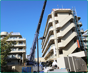 工場・オフィスビル・病院などへの重量物の搬入据付、解体撤去などを行っています。